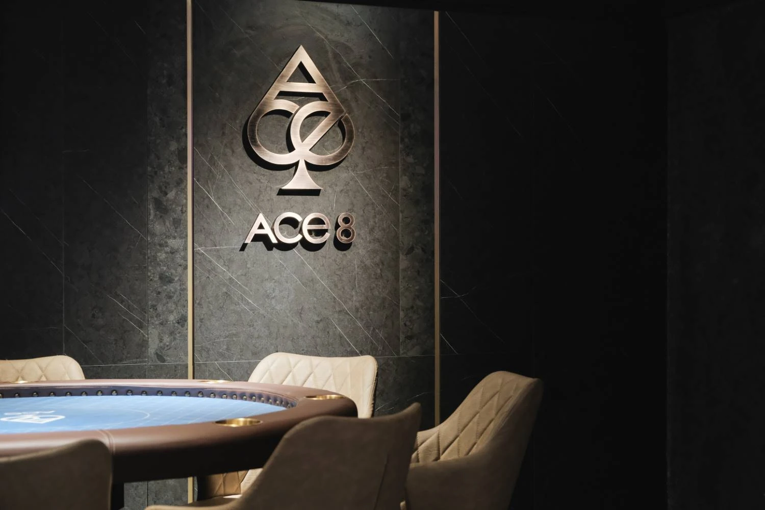 配色以黑·白·灰作為基礎創造出明度層次,金色系金屬作為妝點,主視覺牆面使用石紋、漆面、鏡面與金屬材質堆疊,營造視覺焦點,立面分割與造型靈感來自於籌碼的元素,透過簡化成線的方式去呈現,運用線燈勾勒出俐落